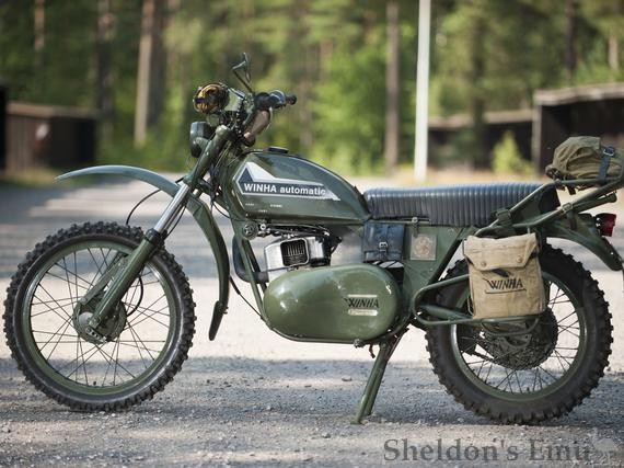 The Winha was built in two versions, enduro and military. Powered by a 340cc vertical twin two-stroke supplied by Kohler of Wisconsin, they had automatic transmission with pull-start, Girling and Marzocchi suspension, and KTM wheels.