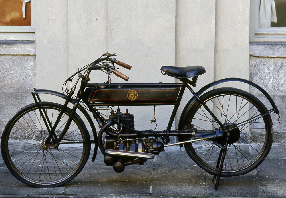 FN began production of bicycle frames in 1885, built their first complete bicycles in 1889 and began motorcycle production in 1900. These first machines were single-cylinder belt-driven bikes of 135cc, 1.25 hp with an automatic valve.