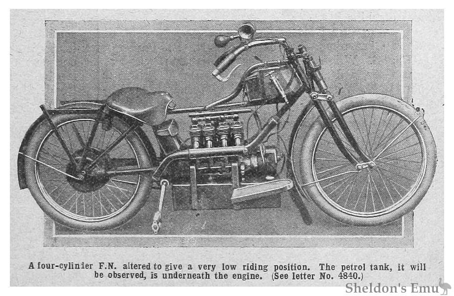 A four-cylinder F.N. altered to give a very low riding position. The petrol tank, it will be observed, is underneath the engine.