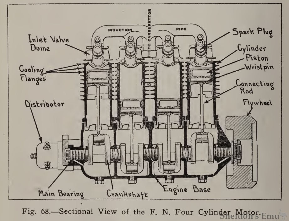 A sectional view of the F. N. four-cylinder engine, which shows the practical application of a five-bearing crankshaft and the arrangement of the crank-pins, so two pistons are going down while the other two are on their up stroke, is presented at Fig. 68. It will be noticed that the Henderson crankshaft, while it has four crank throws, is a three-bearing form, having one main journal at the center and one at each end, whereas the F. N. design has a bearing between all crank throws as well as at the ends of the crankshaft.