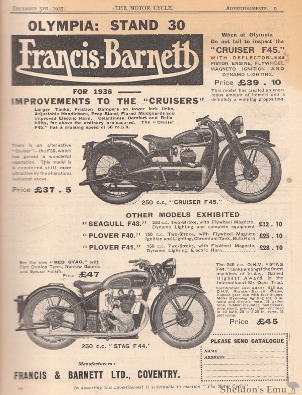 1930s The new decade brought new models and, in particular, the Cruiser. It had a new frame design and an enclosed engine, gearbox and rear chain, using panels that left just the cylinder in view. For the rest of the decade, the firm produced mainly two-strokes. These had names such as Merlin, Kestrel, Lapwing and Plover.