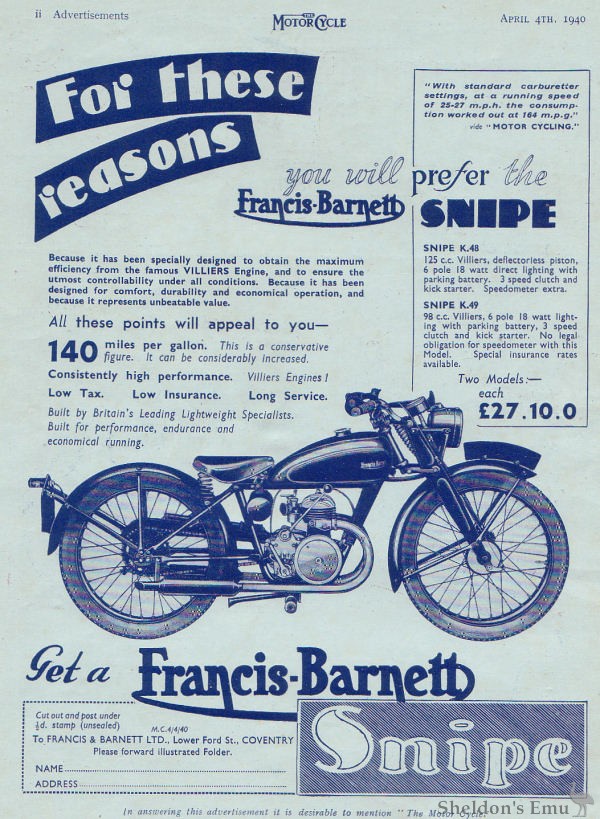The new Francis-Barnett was effectively an Invicta from A. Barnett and Co, with a different tank transfer. This continued until Arthur Barnett adopted the bolted-tube frame design.