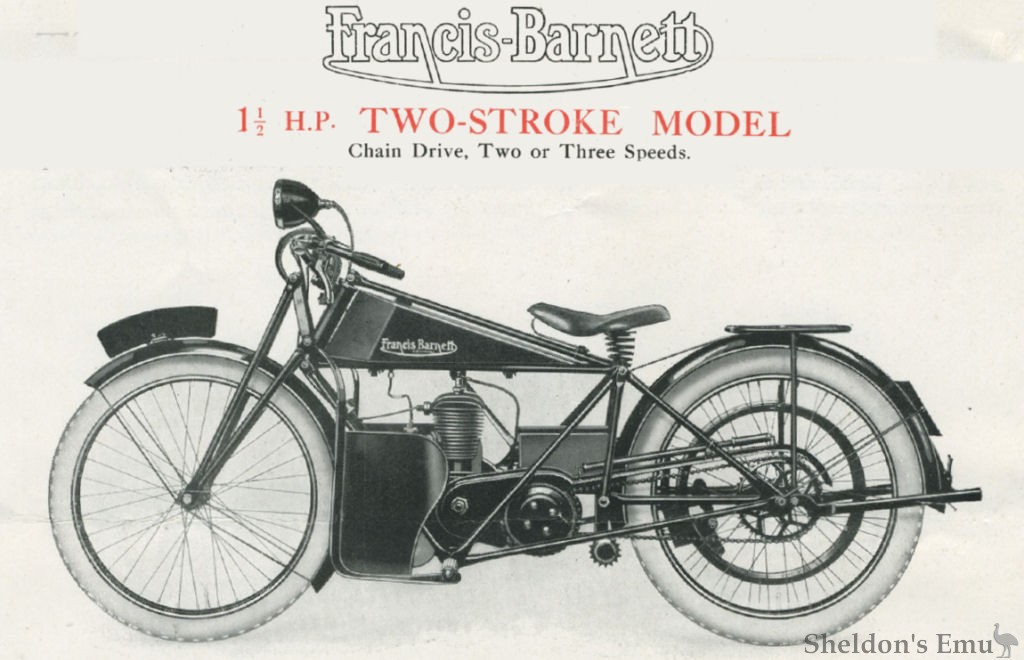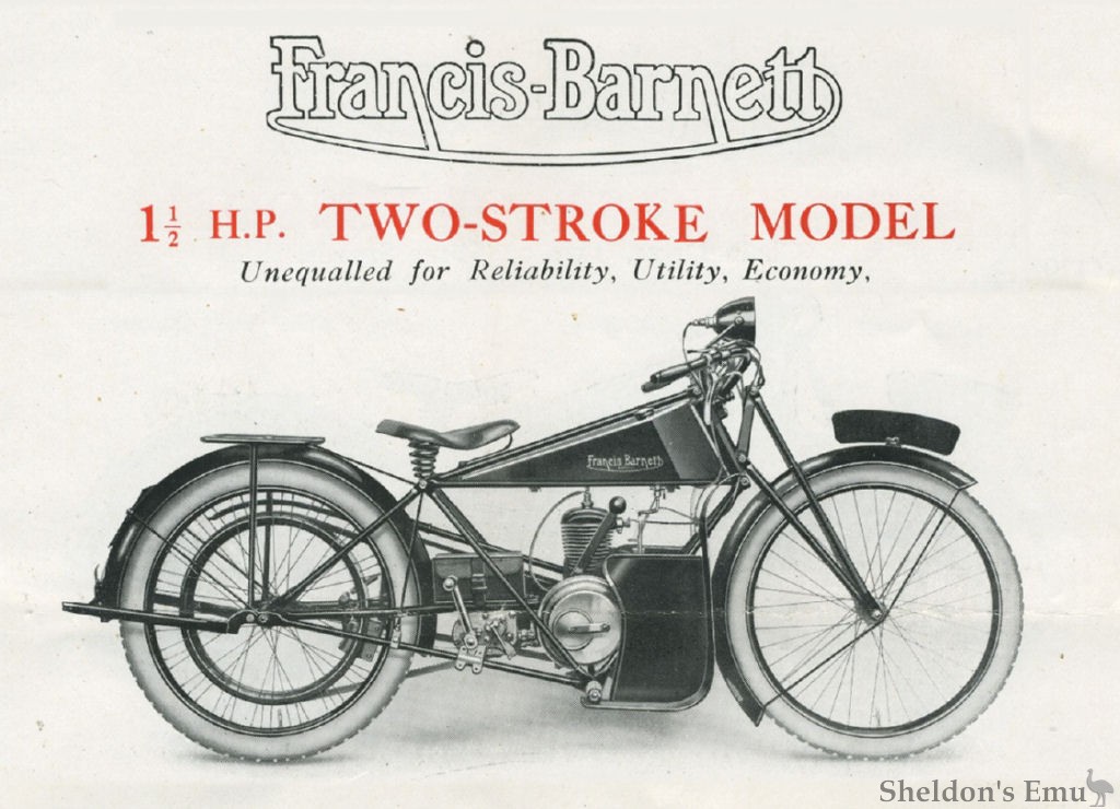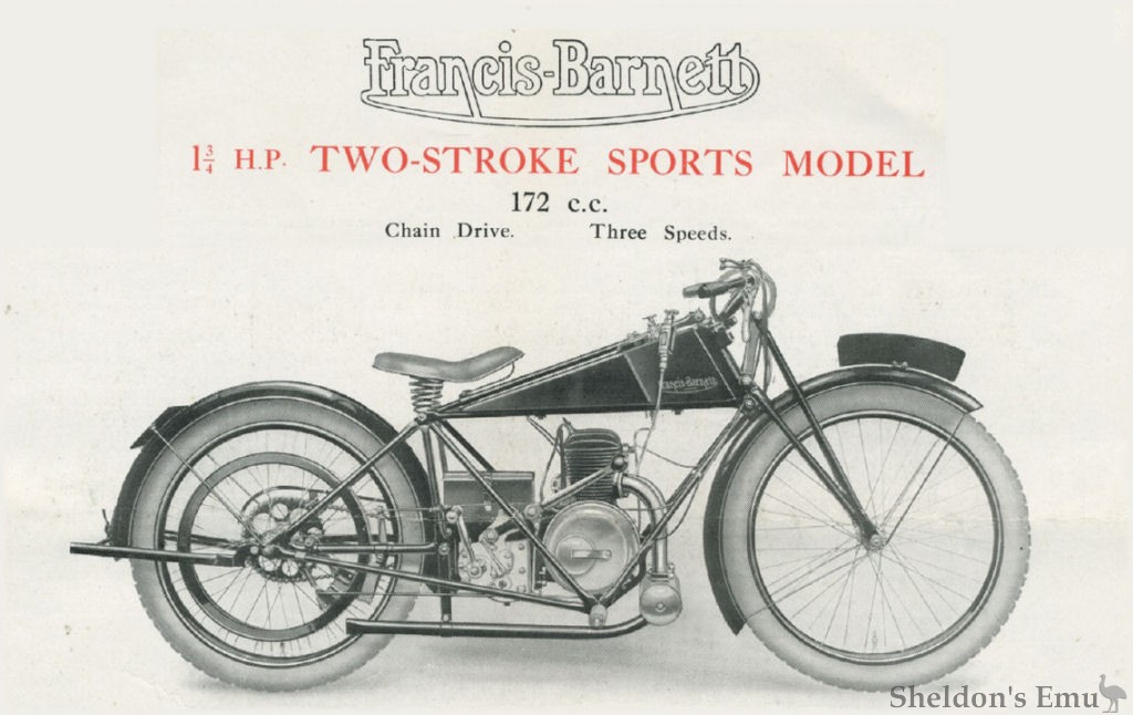 The Francis-Barnett was awarded Two Gold Medals in the A.C.U. 1,000 miles Stock Trial, and a Gold Medal and Silver Medal in the Scottish Six Days' Trial, 1924. Belt driven machines were used in the former event and Chain driven in the latter.