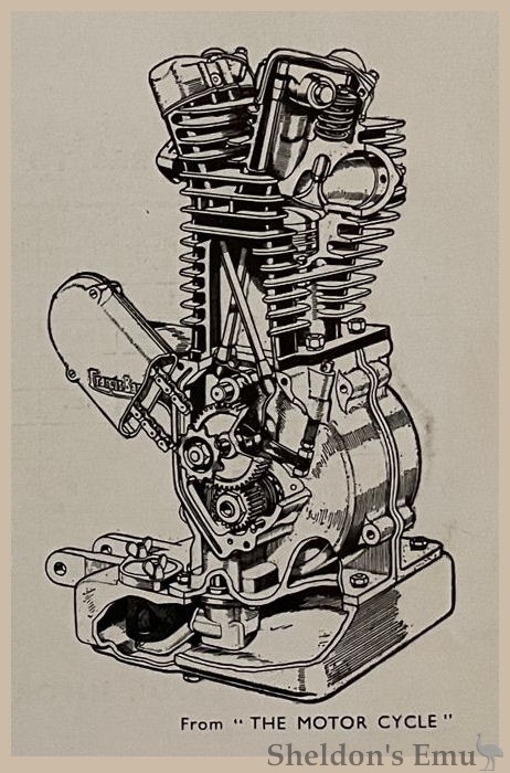 The illustration shows the 'Stag' engine, partly sectioned to exhibit the internal arrangement. The totally enclosed valve gear and straight valve rockers are shown, also the angle of the "cross over" push rods. The valve rockers have a direct oil feed under pressure. The upper rockers with pivot bearings are enclosed in detachable castings, each of which is provided with a removable cap for adjustment of valve clearances.