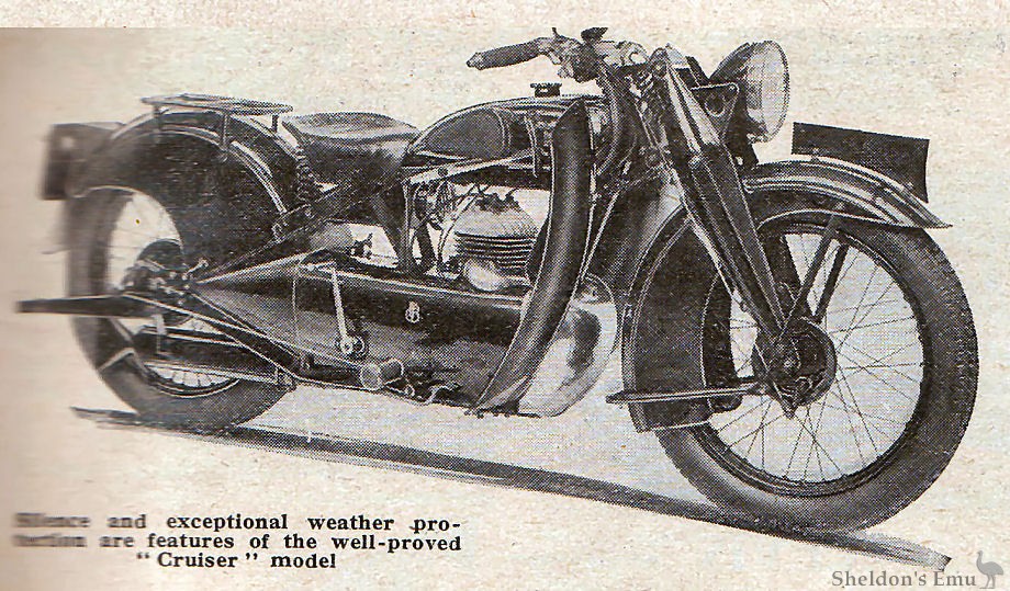 The all-enclosed “Cruisers” are better than ever. One model has the 249 c.c. flat- topped piston engine, and the other the standard Villiers. Larger tanks, friction shock absorbers and prop-stands are among the improvements.