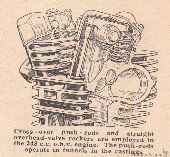 Cross-over push-rods and straight overhead-valve rockers are employed in the 248 c.c. o.h.v. engine. The push-rods operate in tunnels in the castings.