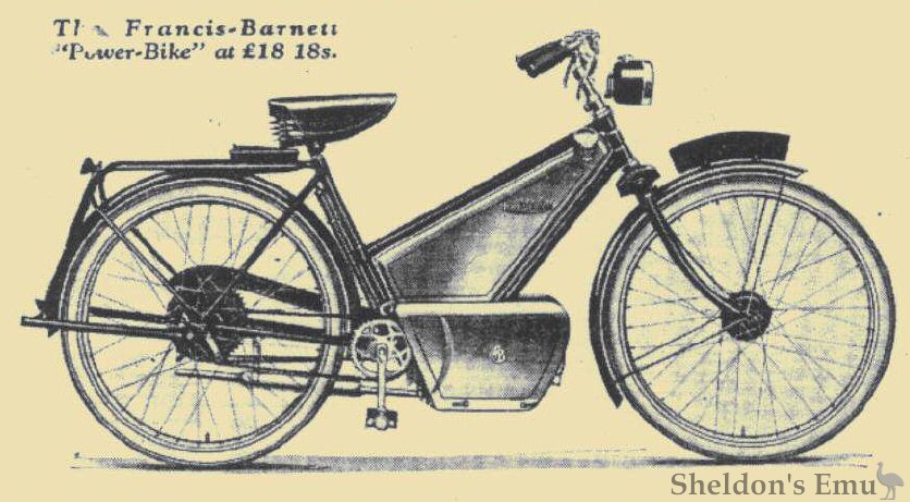 FRANCIS AND BARNETT, LTD., famous as manufacturers of high class two-stroke machines, are introducing a "Wilfred" which incorporates several novel and ingenious features. Simplicity is the keynote of the design, but the comfort and cleanliness of the rider have received the most careful consideration by fitting a spring front fork and totally enclosing the power unit. The new model will be known as the "Power Bike" and will cost £18 18s. fully equipped The power unit is the famous 98 c.c. Villiers job with a bore and stroke of 50 mm. and the primary chain and clutch are enclosed in an oilbath. Separately adjustable chains are used for the pedal gear and the final drive from the engine.