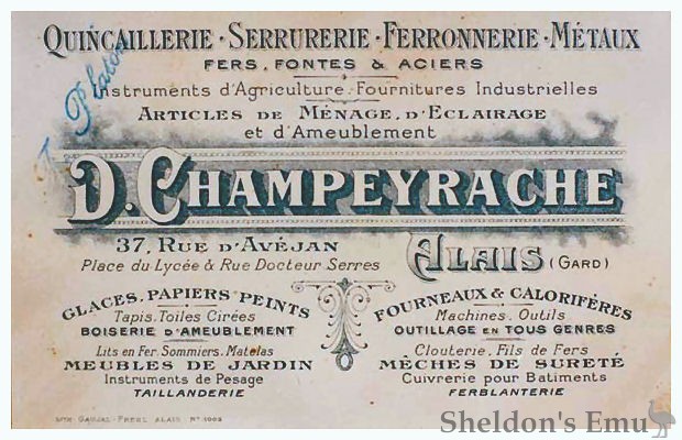 A 1901 De Dion-Bouton automobile associated with the name D. Champeyrache was sold by Bonhams July 2009. There is however no evidence to suggest that they built motor bicycles or tricycles.