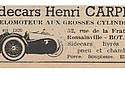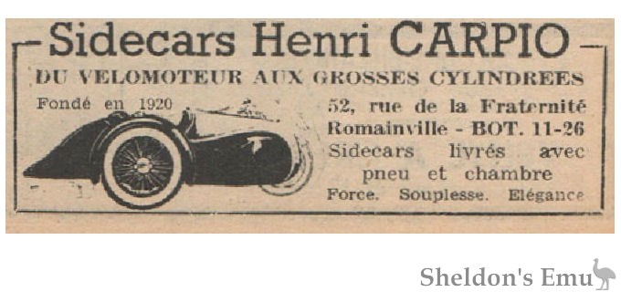 There is also a Henri Carpio Sidecars of Romainville, Paris, founded 1920 according to their advertising, they are believed to have been sidecar manufacturers from 1932 to 1953. Some of their sidecars are said to be very similar to the Bernardet. Models include the Carpio GT of 1933.