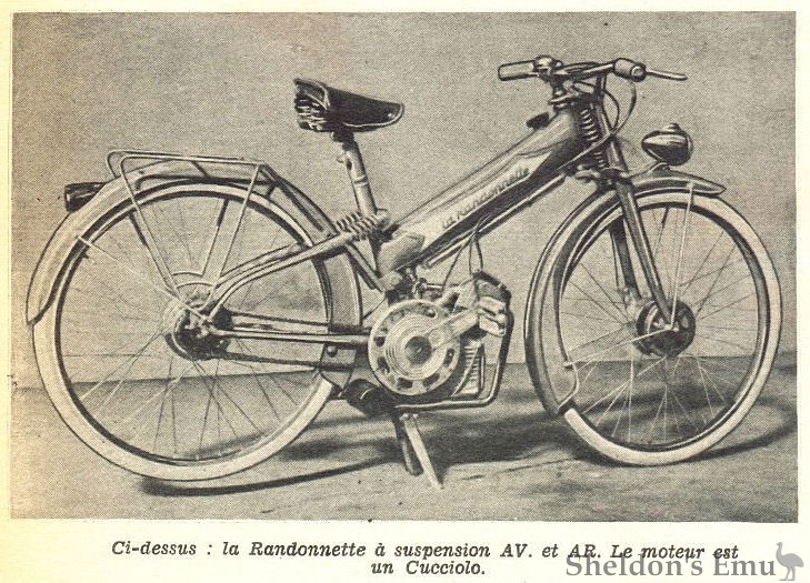 Manufactured by M. Pichon [La Randonnette] – 65 rue Aristide-Briand, Chateau-du-Loir (Sarthe). Fitted Cucciolo engines under licence from Rocher.