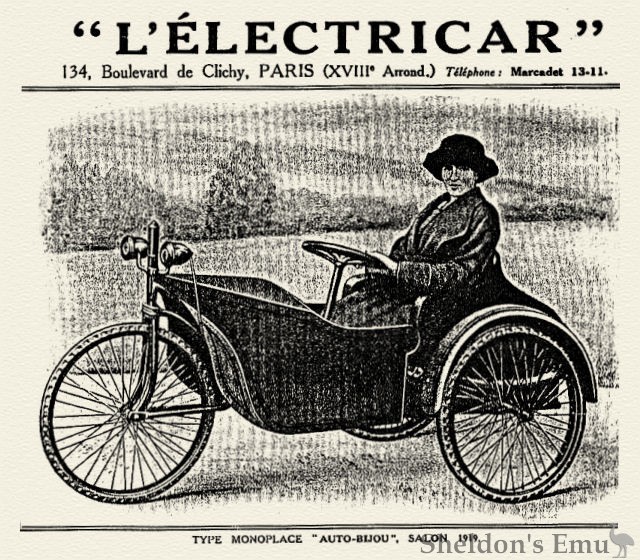 The following year a "Pierre Ligez" tricar appeared in the press, consisting of a motorcycle with a 4½ h.p. Buchet V-twin engine, to the front of which was mounted a two-wheeled platform with leaf-spring suspension.