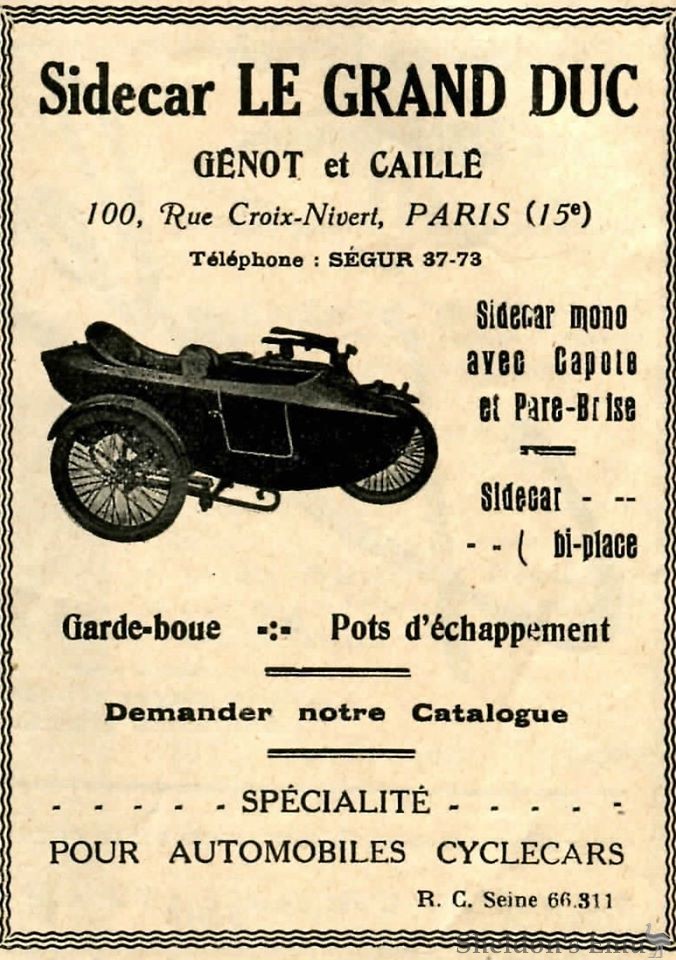 Sidecars built by Genot et Caille, 100, Rue Croix-Nivert, Paris, (15) in the 1920s.