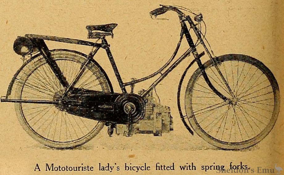 An ordinary bicycle frame fitted with a spring fork. Velotouriste proprietary engine unit. Chain transmission. 26 x l¾ in. tyres.