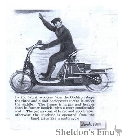 "In the latest scooters from the Otobiron shops the three and a half horsepower motor is under the saddle. The frame is larger and heavier than in former models, with a more comfortable seat. The pedals control brake and accelerator; otherwise the machine is operated from the hand grips like a motorcycle." ~ Popular Science, March 1922.