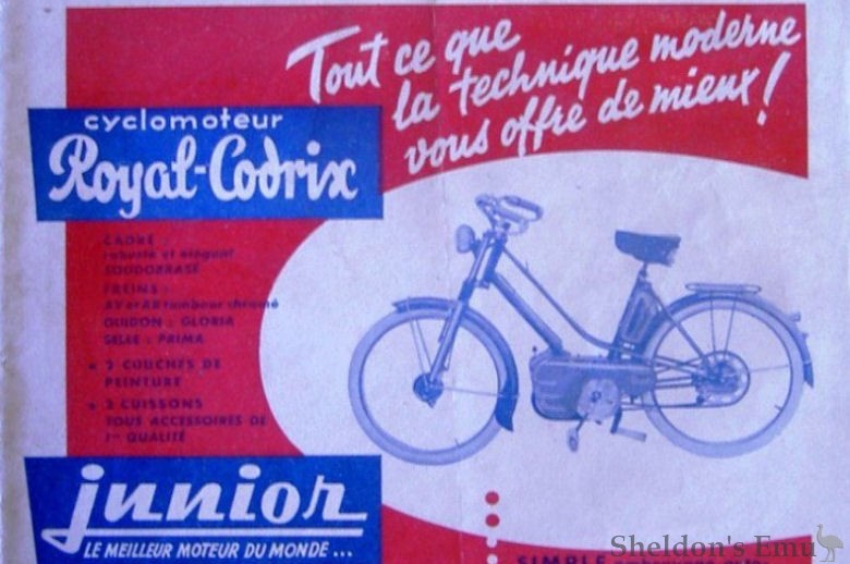 Built by Codridex Et Fils in Angouléme. Two are known to have survived, one of which has a SER Veloto 65cc engine. A 1954 issue of La Revue des Agents shows it fitted with a Junior engine.