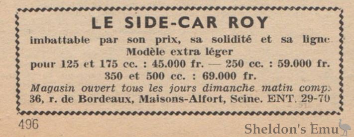 English: At Roy's. - Eight sidecar models, undoubtedly well-known, but completely transformed for 1936, ranging in size from the 175 to the 350 cmc motorcycles, therefore a specialist in lightweight sidecars. The types are divided into Mouche, Grand Sport, and Grand Routier (with a soft top). Of particular note: The bodywork, with its new lines and fully aerodynamic design, treated using a new process with high-strength materials, has allowed for a maximum reduction in weight; it is one of the lightest on the market; the whole unit weighs only 29 kilograms.