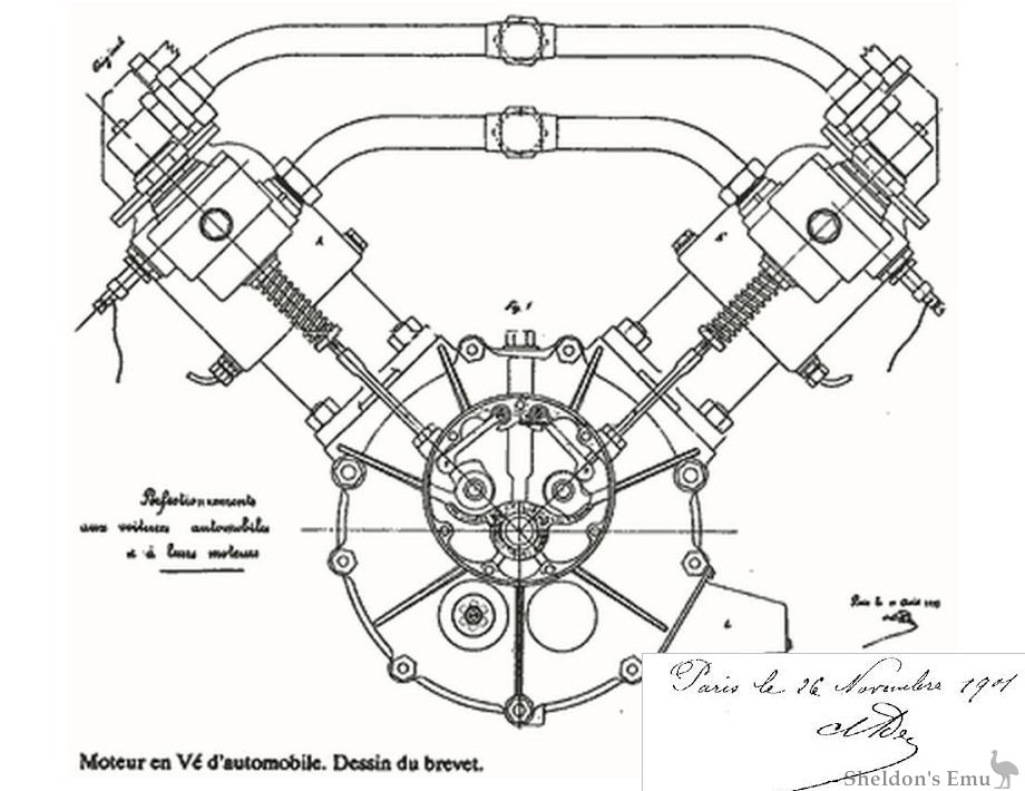 Lot 204 is described in the auction catalogue as "c.1906 Moto de course 2 cylindres 1000 cm3 inconnue". The similarity between this engine and that in Ader's patent drawing of November 1901 is unmistakable. There are letters stamped into a metal plate directly below the carburetter on the starboard side but they cannot be clearly distinguished from the photograph. The cable mount would probably need to be removed to gain access.