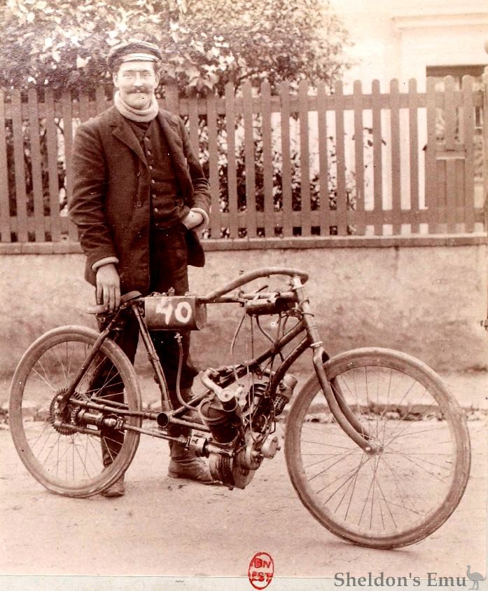 More recently, in his zhumoriste blog Bourdache writes, "At the 1903 Paris Motor Show, a Moto Cardan was presented, equipped with a large Ader brand transverse V-twin engine with automatic valves."