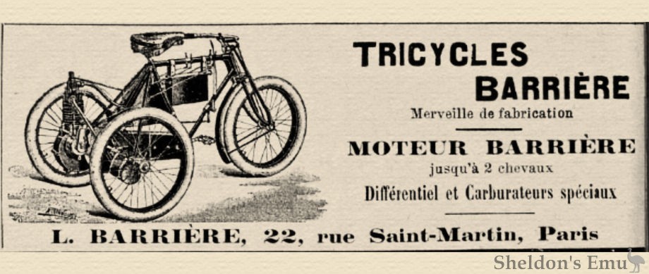 Among the motor cycles a novelty will be found in the Barriere sociable. This is built on the same system as the Barriere tricycle, which has already been fully described in our pages, but two saddles are fitted side by side with a long adjustable handle-bar in front. By mutual arrangement either rider can steer or drive, whilst comfortable footrests of respectable dimensions are fitted. This should meet the views of those who object to trailers or tandems.