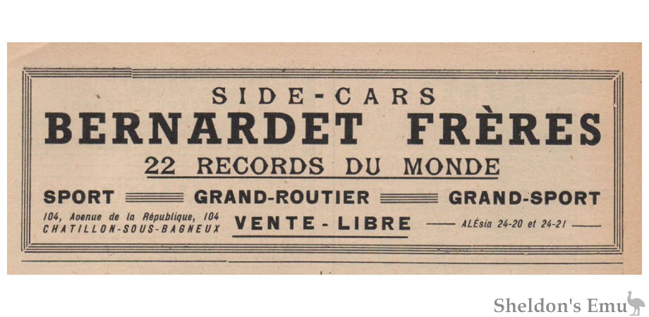 The history of the firm dates back to 1921 when the brothers René, Robert and Roger Bernardet built their first sidecars and presented them at the Paris, Berlin and Geneva shows. They supplied sidecar bodies René Gillet.