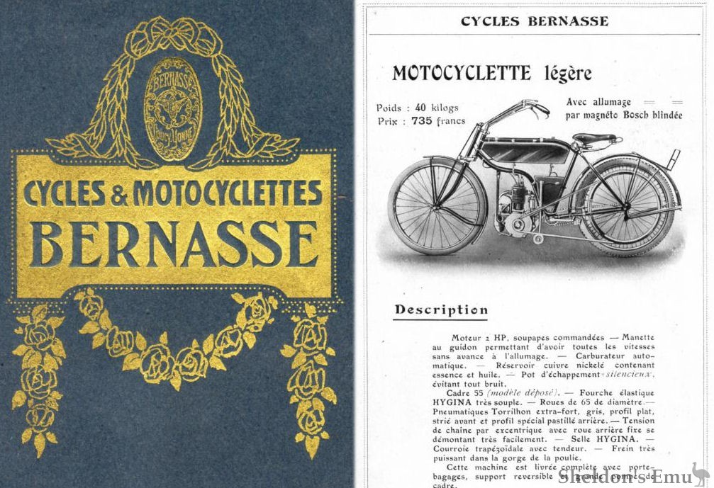 V-twins and single-cylinder motocyclettes built by Maximilien Bernasse, c1906-1914, using engines from Deckert of Paris, among others. A c.1906 example which was part of the Guélon Collection has a single cylinder engine mounted low in the frame in front of the pedal crank, and is fitted with a Hygina central spring fork. Another machine from 1900 has a 302cc SV engine and cylindrical fuel tank.