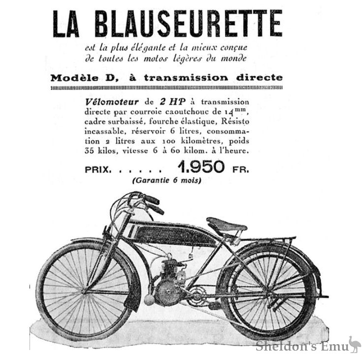 Blauseur built two models: The Blauseur scooter, and later the Blauseurette motorcycle. Documentation exists of Models D and E, but predecessors are currently unknown. Both were powered by B.C. engines with Picard 2-speed gearboxes.