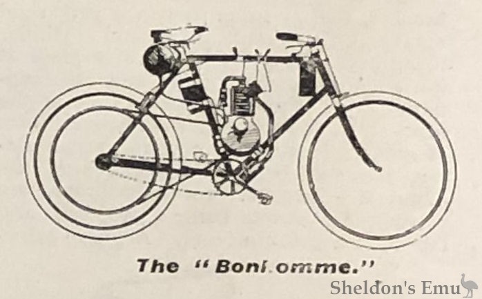 The "Bonhomme" Motor-Bicycle. - This machine was exhibited at the Paris Show. It has a 2 horse-power motor placed vertically between down tube and diagonal. The ignition is by coil and accumulator. Lubrication is effected by means of a small force pump. Either a Longuemare or Roubeau carburetter can be fitted, the first named running on alcohol if desired. The petrol tank has a capacity for two litres, sufficient for 80 to 90 miles running. The drive is by means of a round leather belt. Two brakes are fitted, a tyre brake for front wheel and Bowden rim for back wheel. The price is £34, and makers are J. Bonhomme et Cie, 6, Rue St. Marc, Paris.