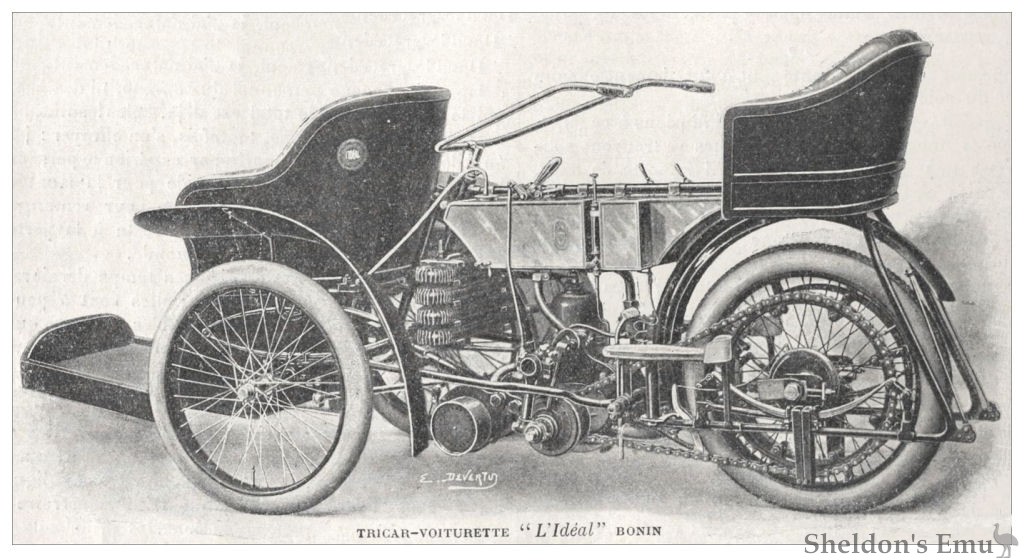 Émile Bonin built motorcycles with full suspension, using his own engines named L'Idéal.