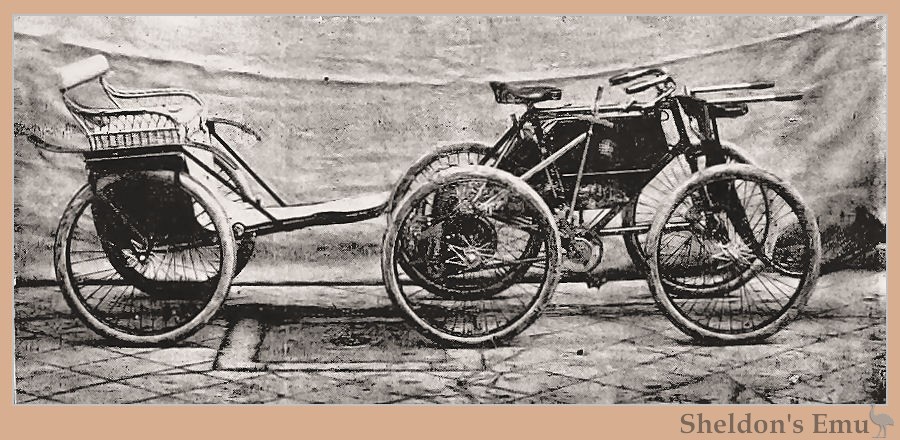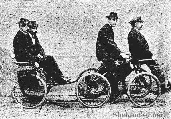 These were modified De-Dion Bouton tricyles with a pair of front wheels added and a passenger trailer at the rear. Some models carried four people by the addition of a seat in front of the rider, forecar style, above the front axle.
