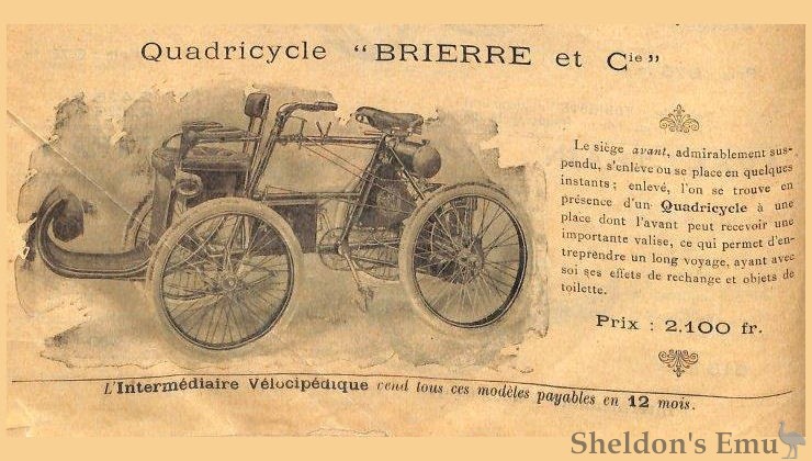 Established in 1898, E.J. Brierre, Perrenoud and Gansewinkel built trimoteurs, quatris and automobiles with petrol engines. In 1901 Brierre took over the distribution of the Cottereau brand for the greater Paris area, and built cars of that name under licence. Automobile production ended in 1903.