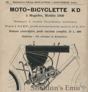 Founded in 1836, the firm built weapons and bicycles at 7 Cours Fauriel, Saint-Etienne. Motorcycles first appeared in their 1909 catalogue advertised as a "Moto-Bicyclette KD" of 1¾ h.p. These were Keller Dorian engines.
