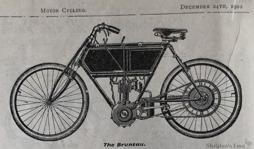 The BRUNEAU motorcyclette is constructed by P. Bruneau and Co., a´ Tours (Indre-et-Loire). It has a vertically-placed motor of 2 horse-power. The frame is of a good rigid design, with extra horizontal tube. The carburetter is of the spray type. The transmission of power is effected by a chain, and a clutch worked by a lever is fitted to the motor shaft. Ignition is by coil and accumulator. Duplicate front forks are fitted, and also two rim brakes. The petrol tank carries about 1¾ gallons of petrol, and 1¾ pints lubricating oil. A large silencer is fitted, and general finish is excellent. Price £38.