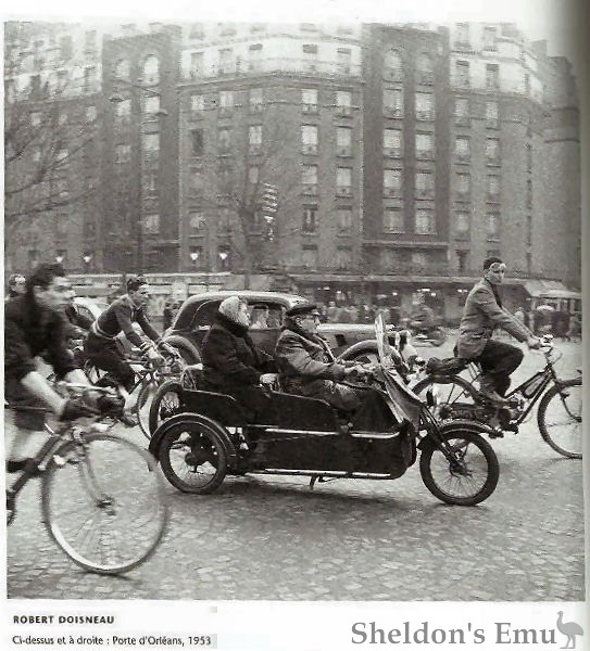 A Brunner tricar is featured in a photograph by Robert Doisneau titled Ce-dessus et a droite: Porte d'Orleans, 1953.
