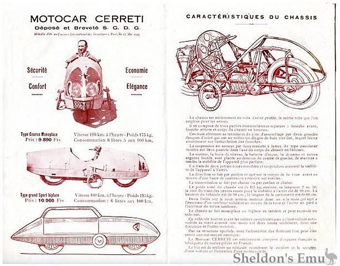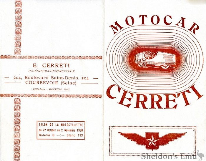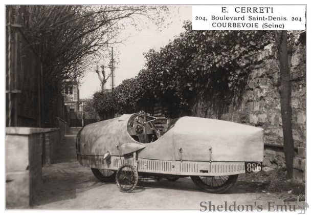 The Cerreti monocar had a 500 cc engine with magneto ignition. Only one model was produced, in fairly low volume. The company manufactured pillion seats, exhaust components, footrests and other motorcycling accessories.