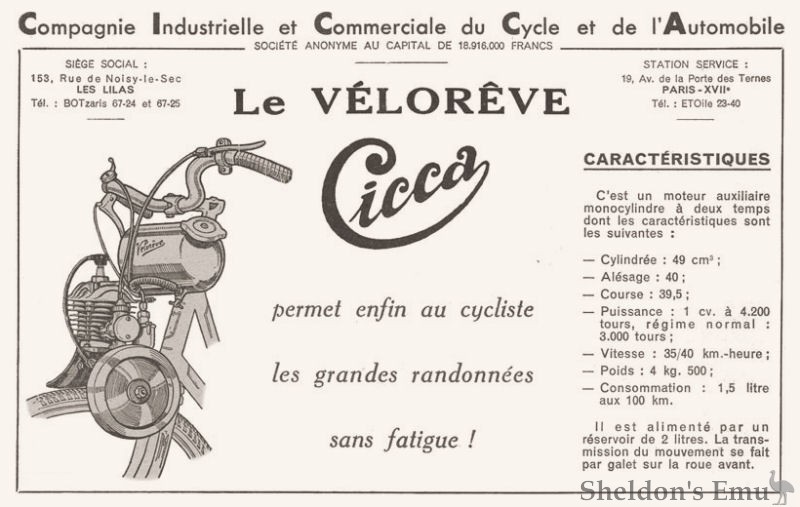 From 1949 until about 1953 the firm built Cicca Véloreve 48cc single-speed auxilliary bicycle engines which were fitted to other marques, the Scoto Tubauto for instance.
