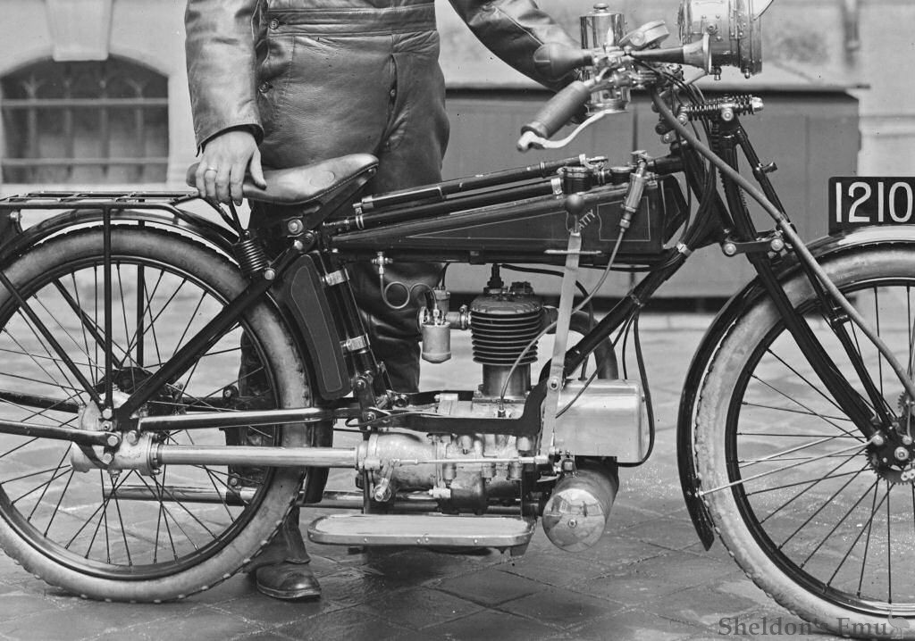 A drum on the rear wheel hub carries an internal and an external brake. Change of speed is effected by a lever on the right-hand side, with a gate giving two speeds and neutral positions. Among the features of the machine might be mentioned the exhaust pipe, the diameter of which is rather greater than that of the exhaust port, and the big capacity silencer mounted just ahead of the engine and under the magneto bracket. The exhaust is therefore got rid of with an absence of back pressure and without noise. The weight of the machine, fitted with 26 x 2¼in. tyres, is just a little over 150 lb.