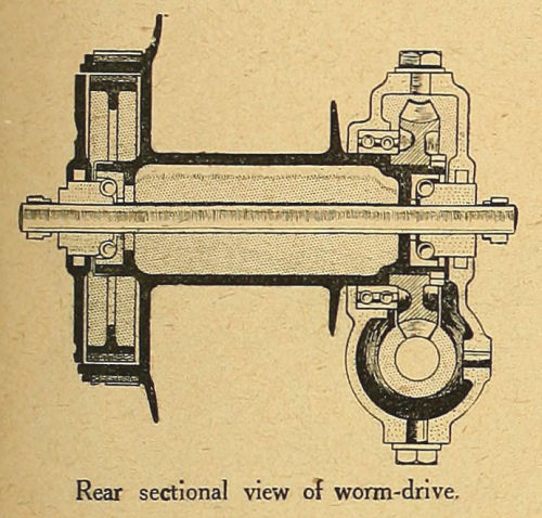 Hyatt roller bearings are employed for the gear shafts. From the gear box to the underslung worm on the rear wheel hub there is a propeller shaft with ball ends, one of which is received in a socket in the driving and the other in a similar socket in the driven member. The shaft, alone, cannot transmit power, but it is surrounded by a closely wound circular section coil spring, the two ends of which are screwed into and rigidly attached to the driving and the driven members. There is sufficient flexibility in the coil spring to take up all irregularities of the drive, as when running slowly or when starting away, and yet a perfectly rigid drive is secured when the engine is developing its full power.