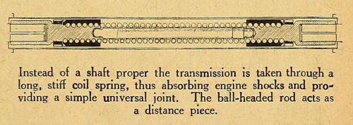 Instead of a shaft proper the transmission is taken through a long, stiff coil spring, thus absorbing engine shocks and providing a simple universal joint. The ball-headed rod acts as a distance piece.