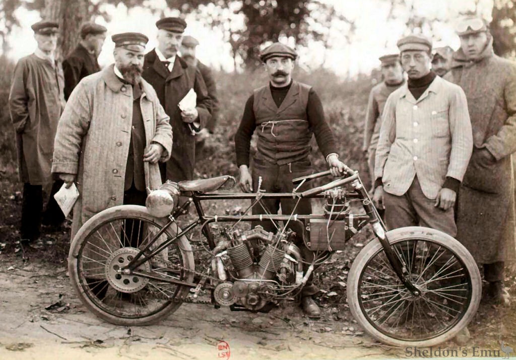 In 1901 his first motorcycle appeared, and gained immediate recognition when, at the 100 km Critérium on the Parc des Princes velodrome in Paris on October 24th, the Autocyclette won first and second place in its category.