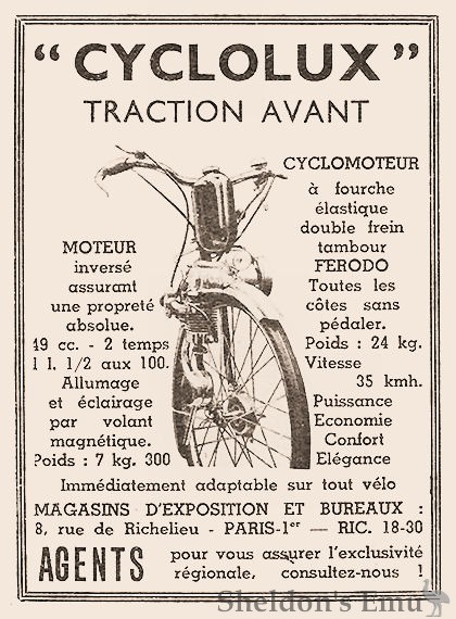 They can be mounted below the saddle to drive the rear wheel by roller, or can be fitted to the fork yoke to drive the front wheel. The marque appeared at the 1950 Paris Salon.