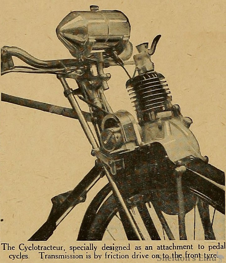 Cycle attachments appear to be attracting the attention of French designers. The Cyclotracteur is a neat little four-stroke engine (50 X 55 mm.) with automatic pressure lubrication. The motor is carried by special front forks, and drives by friction on to the front tyre. A clutch is obtained by moving the friction wheel away from the tyre in a lateral direction.