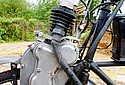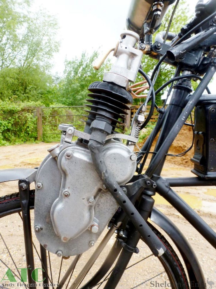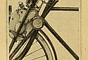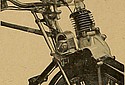 A single-cylinder engine of 50x55 mm. bore and stroke is suspended in a V shaped tubular frame, the converging ends of which are fitted into the front wheel hub spindle, whilst the long arm of the frame is attached to the head of the cycle frame. An automatic inlet valve is used, whilst the exhaust is mechanically operated. Petrol sufficient for a fifty-mile run is carried in a circular tank clipped to the handle-bars, adequate lubrication being effected by a small gear oil pump in the crank case sump.
