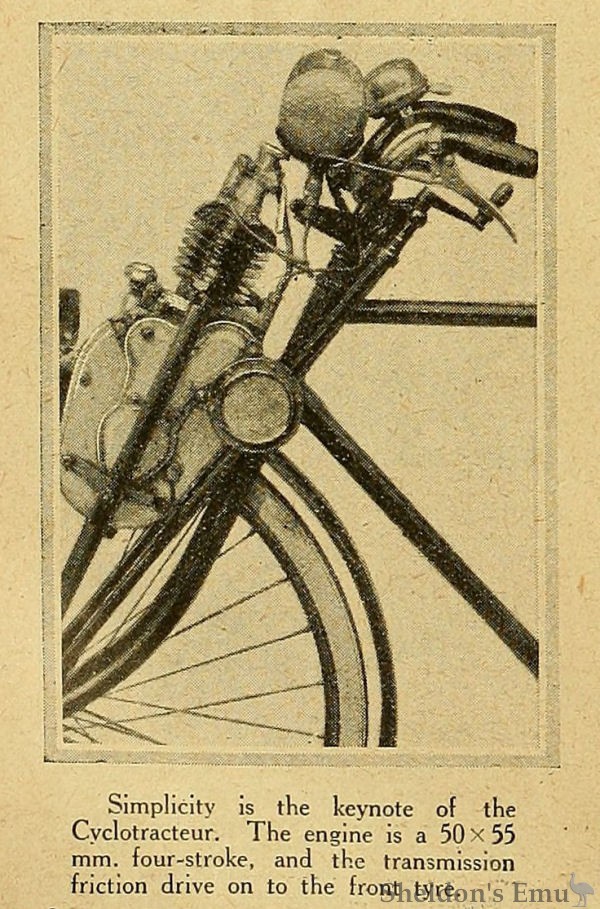 Simplicity is the keynote of the Cyclotracteur. The engine is a 50x55 mm. four-stroke, and the transmission friction drive on to the front tyre.