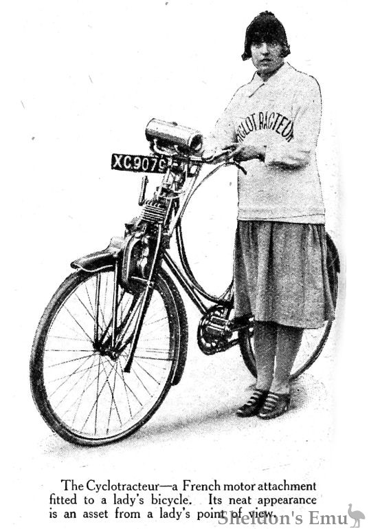 The Cyclotracteur - a French motor attachment fitted to a lady's bicycle. Its neat appearance is an asset from a lady's point of view.