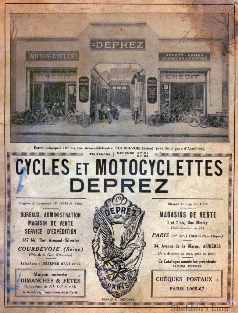 The firm was still operating in 1937 at the Courbevoie address, offering motorcycles from Terrot, Peugeot, Automoto and others, along with sidecars from Vannod, Bufflier and Bernardet. Their catalogue was extensive (80 pages) and included leather apparel, sparkplugs, speedometers, lights, levers, tyres, hub brakes and racks along with a variety of Deprez bicycles. They were no longer offering motorcycles with their own brand.