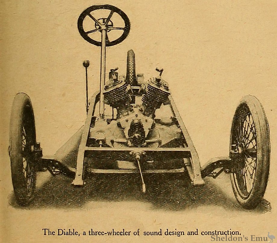 Possibly the neatest and most practical three-wheeler in the exhibition is the Diable, which is fitted with a remarkably clean looking 8 h.p. air-cooled V type engine. The engine forms a unit with a two-speed arid reverse gear, a clutch being located behind the box. Shaft drive is employed throughout, the shaft being articulated at the point where the main pressed steel frame is joined to the spring rear portion. The final drive is by bevels, and the wheel is easily detachable. Suspension is by semi-elliptic springs in front and long cantilevers at the rear.