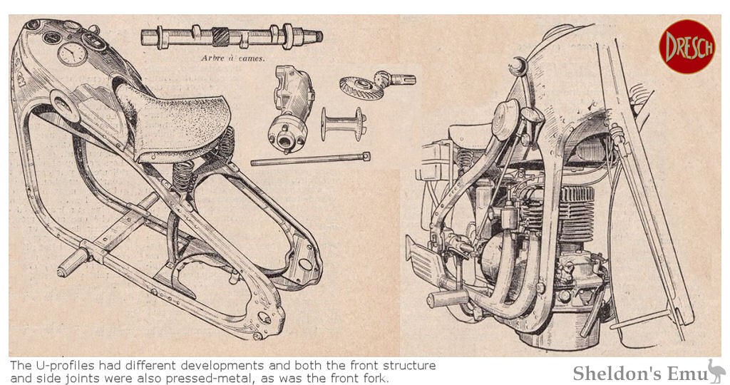 At the 1930 Paris Salon Dresch presented the Monobloc. Designed by Pierre de Font-Réaulx, the frame was a pressed-metal double cradle type. (Stamped sheet metal frames had been in use by German firms since the late 1920s, and were adopted by the French, Italians and Czechs in the 1930s). The U-profiles had different developments and both the front structure and side joints were also stamped, as was the front fork. This achieved a new aesthetic while maintaining torsional stiffness, in addition to reducing the weight to only 140 kg.