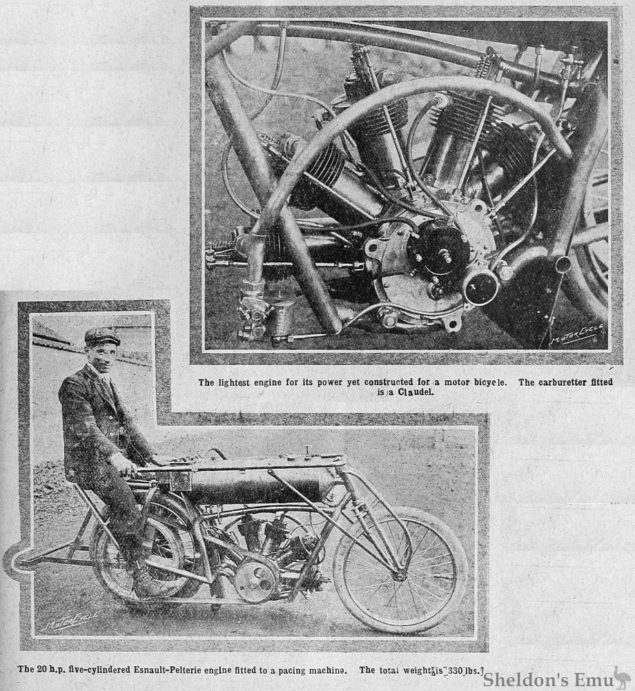The 20 h.p. flve-cylindered Esnault-Pelterie engine fitted to a pacing machine. The total weight is 330 lbs.