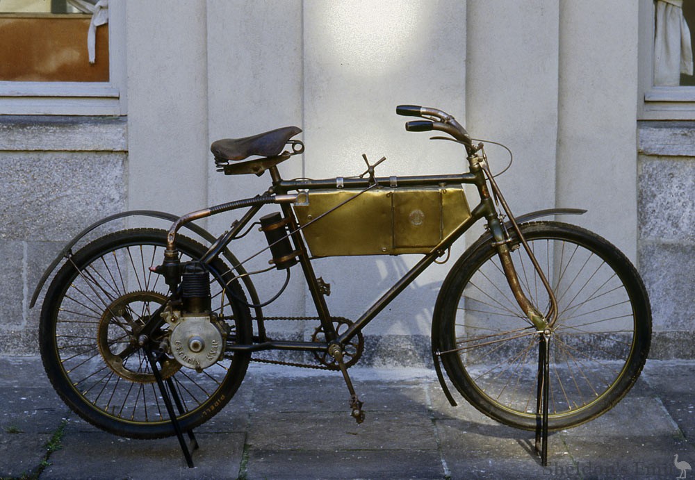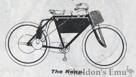On peut aussi employer un moteur Knap, de 6 kg et demi, faisant normalement 2.400 tours à la minute et attaquant directement, par un pignon et une roue dentés, le moyeu de la roue arrière, près duquel il est monté verticalement. Une sacoche-réservoir est placée sur le côté supérieur du cadre. La bicyclette, qui pèse 14,8 kg avec frein et roue libre, ne dépasse pas, en ordre de marche, le poids de 28 kg. Cinq minutes suffisent pour la débarrasser du moteur et de ses accessoires.