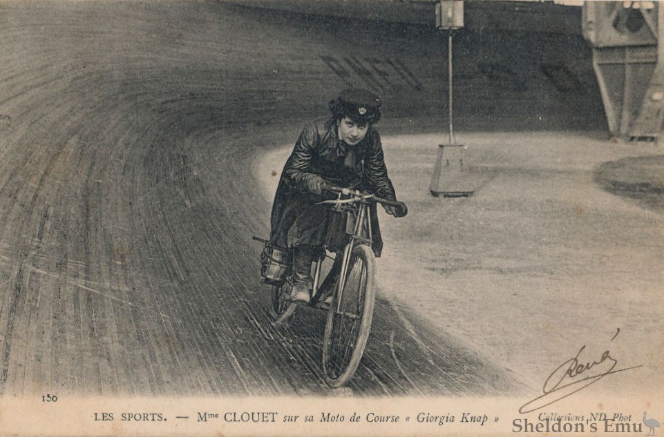 GEORGIA KNAP, Troyes, shows the "Knap" gear-driving motor-bicycle in three powers, ¾, 1¼ and 2 h.p. The principle on which this machine is constructed has been described and illustrated in "M. C." recently. The 1¼ and 2 h.p. machines have duplicate forks and Bowden brakes fitted, and Dunlop tyres on Westwood rims. The light touring machine has the tanks cased over with a canvas cover.